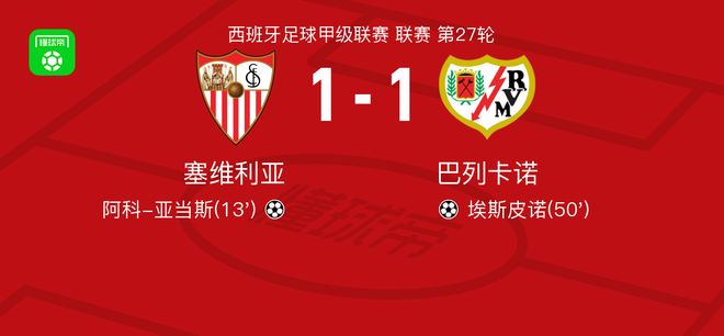 北京时间3月9日西班牙足球甲级联赛 联赛 第27轮,塞维利亚主场对阵巴列卡诺。塞维利亚阿科-亚当斯破门。巴列卡诺埃斯皮诺破门。最终比分塞维利亚 1-1 巴列卡诺。